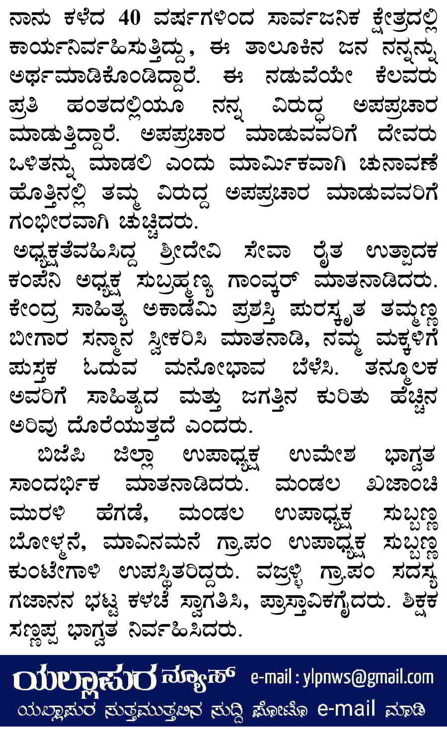 >> ನಾಳೆ ಶುಕ್ರವಾರ ಯಲ್ಲಾಪುರ ತಾಲೂಕಿನಲ್ಲಿ 951 ವಿದ್ಯಾರ್ಥಿಗಳು ಎಸ್ಎಸ್ಎಲ್ಸಿ ಪರೀಕ್ಷೆಯನ್ನು ಎದುರಿಸಲಿದ್ದಾರೆ.>> ಕಾಳಮ್ಮಕೆರೆಯಲ್ಲಿ ಬಿದ್ದ ಒಣಮರ ತೆರವುಗೊಳಿಸುವಂತೆ ಅಗ್ರಹ>> ಸ್ಮಶಾನಕ್ಕಾಗಿ ಕಾಯ್ದಿರಿಸಿದ ಜಾಗ ಒತ್ತುವರಿಯಾದಲ್ಲಿ ಮಾಹಿತಿ ನೀಡಿ